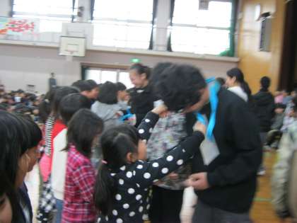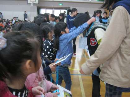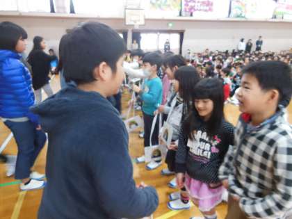 6年生に「今までありがとう。」「卒業おめでとう。」と言いながら渡していました。