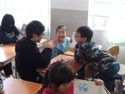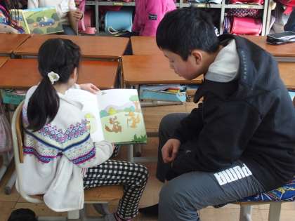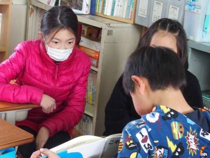 1年生の一生懸命な読み聞かせを笑顔で聞く