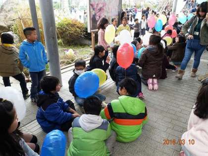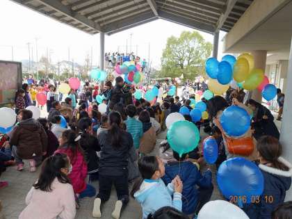 卒業生たちが,保護者の皆さんから風船を渡されます。