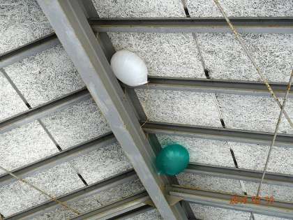 風船が,屋根の軒下にひっかかっています。配られたときに,手を離れた風船です。