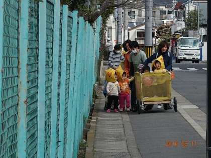 今回,初めて大宮保育園と合同で避難訓練を行いました。黄色い防空頭巾をかぶった園児たちです。