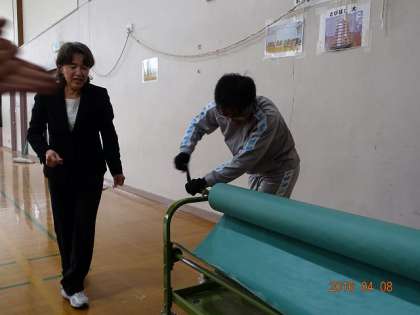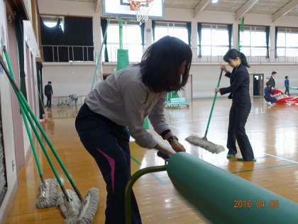 1年生が教室に入っている頃,体育館は後片付けの真っ最中。