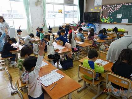 教室に入った瞬間に,子どもたちが一斉に手を挙げたのですが,手の挙げ方もいいですね。肘がピンと伸びて,いい感じです。