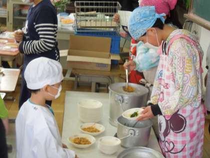 1年生の教室で配膳のお手伝いもしました。1年生は初めてなので,6年生がよそったものを1年生が運ぶという見事な(!?)役割分担の結果,本日の役目はしっかりと果たしました。