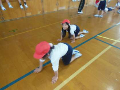 全クラスで体育館に集まって体ほぐしの運動をしました。ワニさん歩きをしたり,カニさん歩きをしたりしていろんな動きを楽しむことができました。
