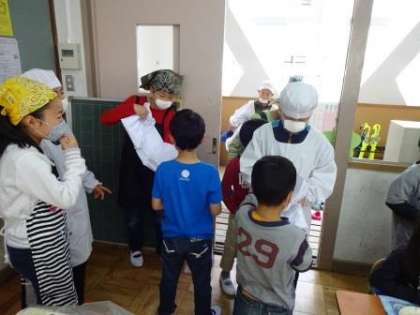 初めての給食当番,6年生が助けに来てくれました。