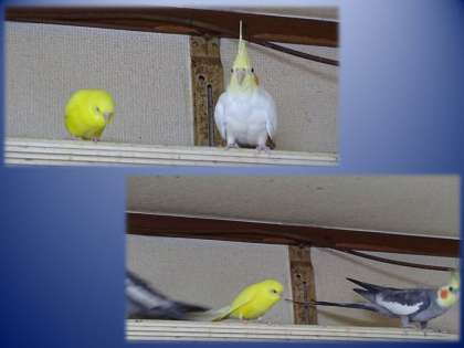 何倍も体の大きいオカメちゃんたちは,セキセイインコを遠まきに,チラ見をしている状態です。