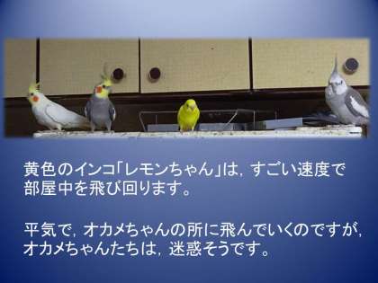 レモンちゃんの方は,高速で飛び回るので,捕まえるのが大変。もはや,手乗りではなくなってしまいました。