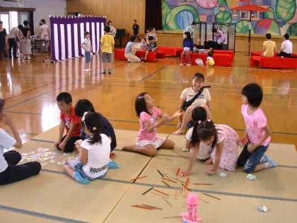 会場の体育館には,七夕飾り作り,昔遊び,お抹茶席が設けられ,子どもたちも楽しいひと時を過ごしました。