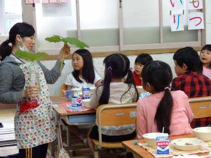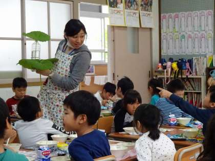 ふきの大きな葉っぱを,栄養教諭の先生が見せに来てくれました。