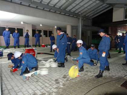 消防分団の訓練です。あいにくの雨なのですが,体育館前のスペースを上手に使い放水の体制・構えを熱心にされていました。実際に放水すると,水圧でふりまわされてしまうのですが,腰を据えて体勢を整えています。