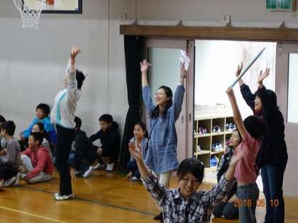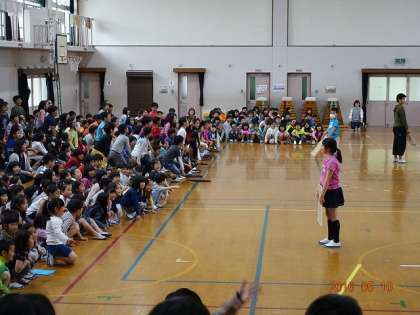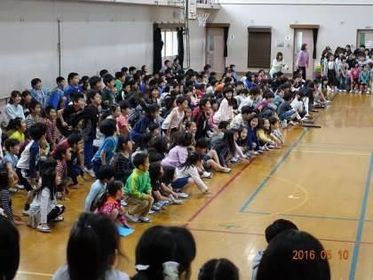 各学年が,ドレミの歌を歌います。各学年で担当階名(ド,レ,ミ・・・)が決まっていて,歌詞に合わせて自分の担当部分になると,学年が一斉にスタンドアップ。
