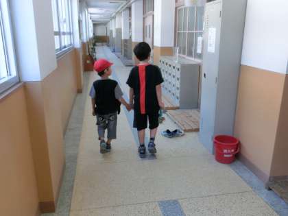 昨年,下校指導で一緒に帰っていた子どもたちが2年生となり,1年生を引率して学校を回っています。