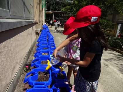 毎朝,学校に来たらまず種に水をやる子どもたち。