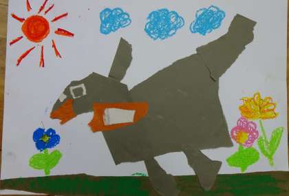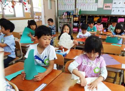 図画工作の時間に,色画用紙をちぎり,できた形から自由に想像をふくらませて