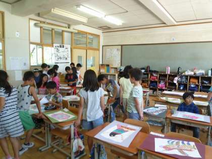 図工の時間に,完成した作品を鑑賞しました。友達の作品のよいところや,頑張っているところを見て,鑑賞カードに記入しました。みんな鑑賞のきまりを守ってできていました。休日参観で掲示していますので,お楽しみに・・・。