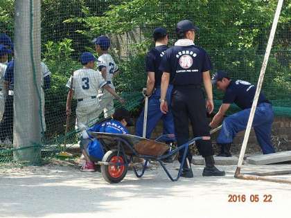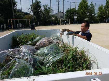 再び運動場へ。運動場においてあるコンテナは,抜かれた草でいっぱい。