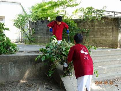 運動場周りの溝掃除に,消防分団の皆さんも協力いただいています。早朝の査閲の後,駆けつけてくださいました。お疲れのところ,ありがとうございます。