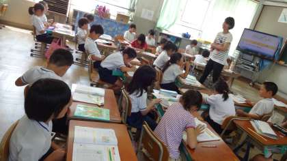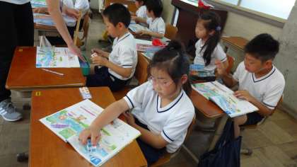 魚の長さを数図ブロックを使って測っている子どもたちです。