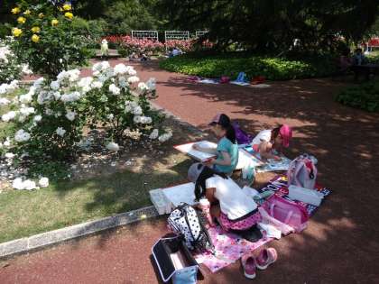 場所を変えると,5年生の2人組が,完全防備で制作に取り組んでいます。なんと去年も来たので,日差し対策をしっかりしてきたとのこと。えらいなぁ。