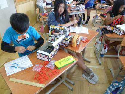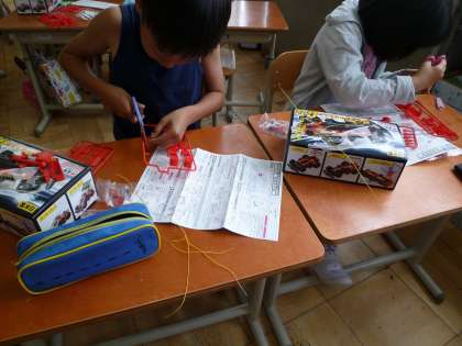 まずは,説明書を見て,組み立てていきました。友達と協力し合って組み立てる姿も見られました。これから電池の実験を楽しんでほしいと思います。