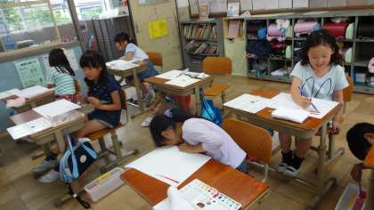 絵具を使った学習がはじまりました。水をあまり筆に含まさずに塗る塗り方や,水をたっぷり含ませて薄く塗る塗り方など,色んな塗り方を学習しました。