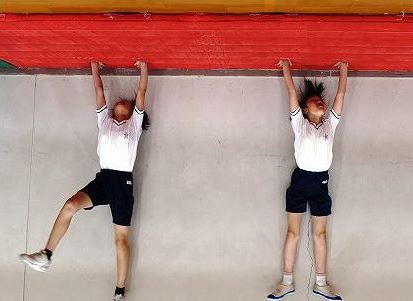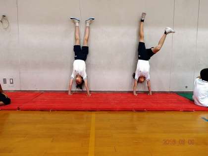 一番下の写真。ジャンプしてマットを持ち上げている女子2人?