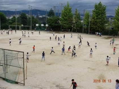昼休みの運動場。水たまりがあって,遊べないし可哀そうやなー と思っていたら,チャイムと共に,ワーッと叫び声をあげながら運動場へやってくる子どもたち。