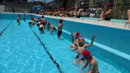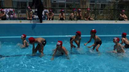 プールに入った子どもたちからは,「気持ちいい〜!」「つめた〜い!」という声があがりました。