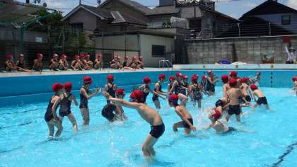 ワニさん歩きや水の掛け合いをしました。