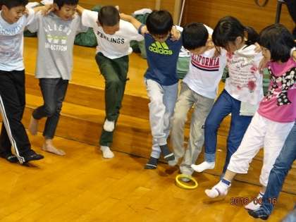 足でわっかを回していくという「リレー」。