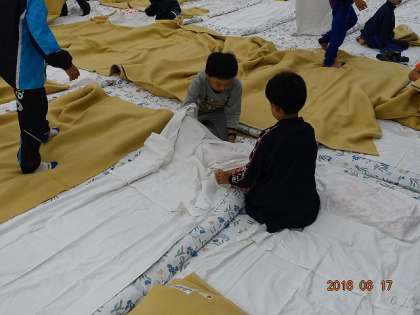 二人一組で、協力し合って寝具の準備をしているのには感心しました。