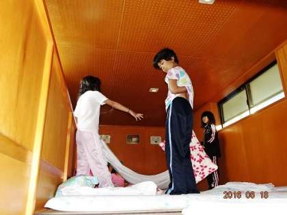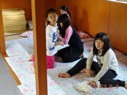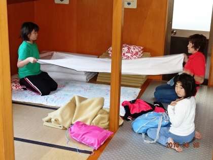 先生と一緒に、寝具の整理。