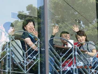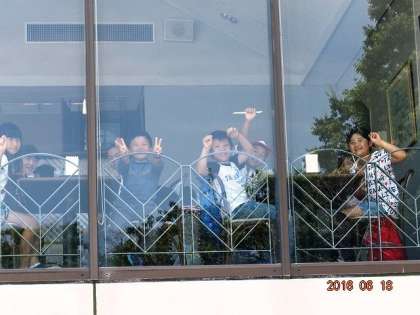 食堂を見上げると,子どもたちがこちらを向いています。