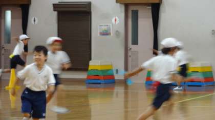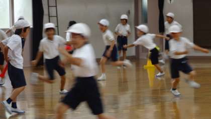 雨が降っていてプールが使えなかったので,全クラスでしっぽとりをしました。