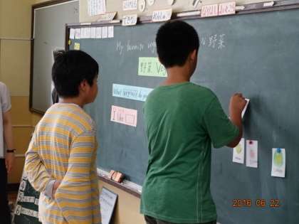 お気に入りの野菜を英語で紹介します。ピクチャーカードを手掛かりに,覚えた英語で最後は,ビンゴ大会! 予想外のスピードで「ビンゴ!!!」の声。