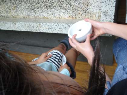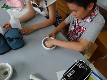 理科室では,乳鉢ですりつぶした軽石を水でゆすいでいます。