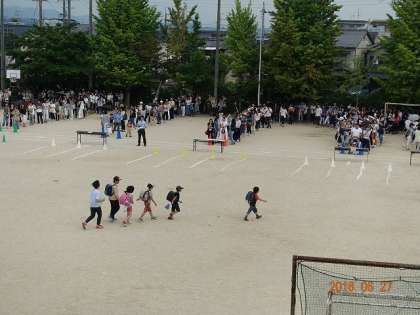 さて,3時からは,避難訓練と引き渡し訓練を行いました。2時30分くらいから,運動場に並んでくださっている保護者もおられました。