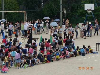 地震の放送を入れ,引き続き運動場への避難の放送をしました。しばらくすると,そらいろ学級のみんなが校庭へ出てきました。多くの保護者の皆さんの視線を一斉に浴びて,一瞬たじろぐ子ども達。その後,続々と子どもたちが引率されて校庭へ避難し始めました。