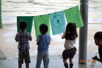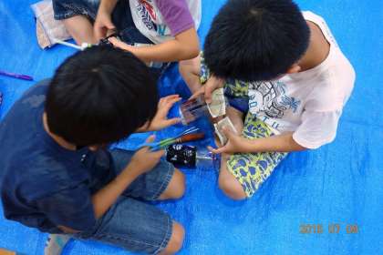 完成した子どもたちは,的に向かって水をピュー。水を入れたペットボトルを押すと,ストローの先から水が出てきます。