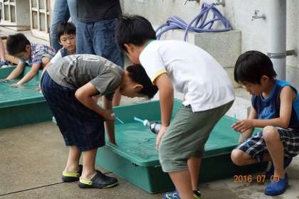 的に書かれた絵が,水性のマジックだから,水をかけると色が落ちていくんです。それを発見した子どもたち。絵を消すのに,必死です。