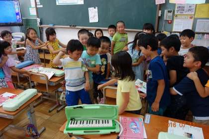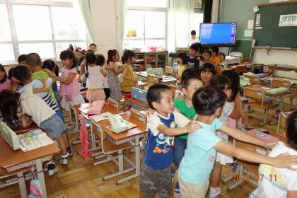 音楽の時間の1年生。先生のキーボード(昔なら,オルガンに・・・というところですが)に合わせて,子どもたちが連なって行進。音楽が終わると,先頭同士が「最初はグー,じゃんけんポン!」負けた行列は,勝った行列の最後尾につながります。