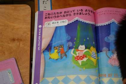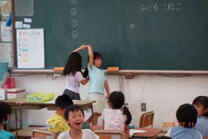 隣のクラスでは,前に女子2人が出て,ダンスを披露。なぜダンスをしているのかな?と思って,聞いてみると,「『おどる こねこ』 の勉強」という答え。意味不明・・・。いろいろ想像するに,「おどる こねこ」という音楽に合わせて,子どもたちが こねこ になったつもりで 踊っている・・・ということかな。
