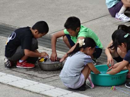 手洗いは,腰をかがめて大変なので,「おしゃべり」は気をまぎらわすのに重要!