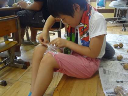 29日(金)サマーチャレンジに向けての準備をしました。かんばんやちらしを仕上げる人,じゃがいもを袋づめして口にテープをつける人とわかれて準備をしました。