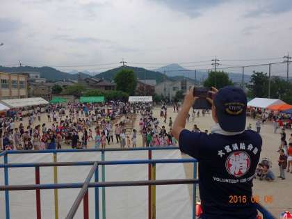 合奏部の演奏中,元PTA会長のMさんと一緒に,全体の写真を撮ろうということで,総合遊具の上から一枚。