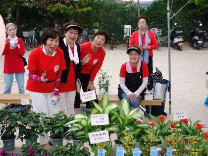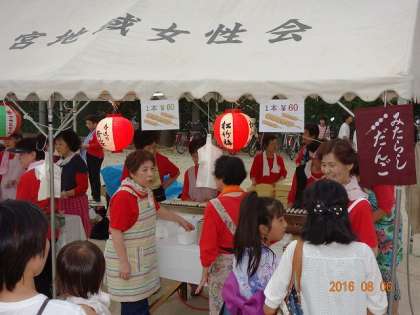 女性会のブース。みたらし団子に,鉢植えなどの販売。