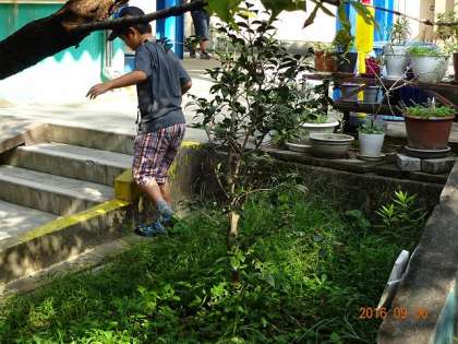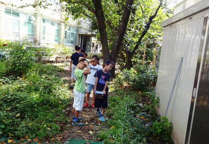 朝から,草むらでなにやら探している子どもたち。3年生かな?