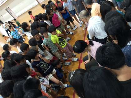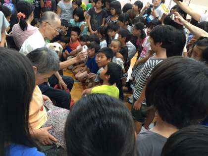 休憩時間には,視覚障害の方々のお話を聞いて興味をもった子どもたちが,周りにたくさん集まっていきました。みんなの前では緊張してできなかった質問も,少人数で距離が近ければ遠慮なく。どんどん質問し,たくさんのことを教えていただいていました。
