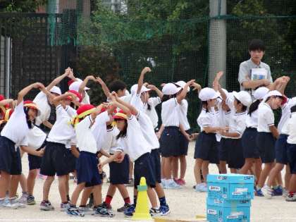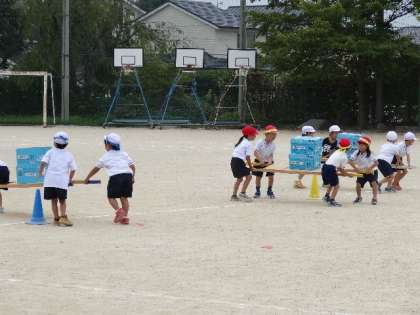 4人で息をあわせておみこしをかつぐのですが,上にのった箱が軽いのかよく落ちます。速すぎてもだめ,遅いとあせる。4人で協力してうまいこと次のグループにつないでくださいね。